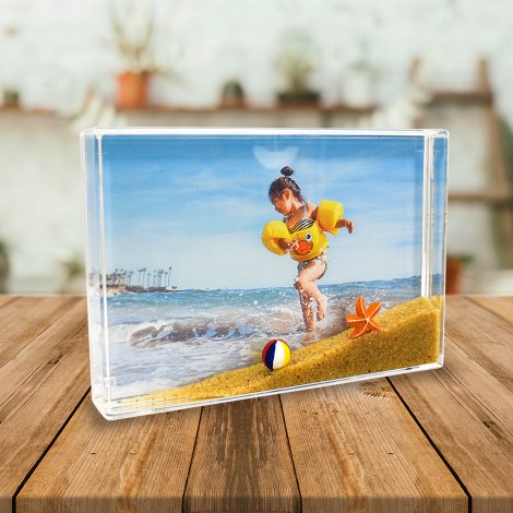 Wilt u uw vakantiefoto een boost geven? Laat deze dan bedrukken op een zandblok. Deze zand foto bestaat uit de door uw gekozen foto en wordt bedrukt op een 2,5 cm dik plexiglas. In het zandblok plexiglas zit een holle ruimte waar zand in gegoten is. Een foto met zand kunt u oppakken en schudden zodat het zand rondom de foto beweegt. Een zandblok geeft een extra dimensie aan uw vakantiefoto’s!