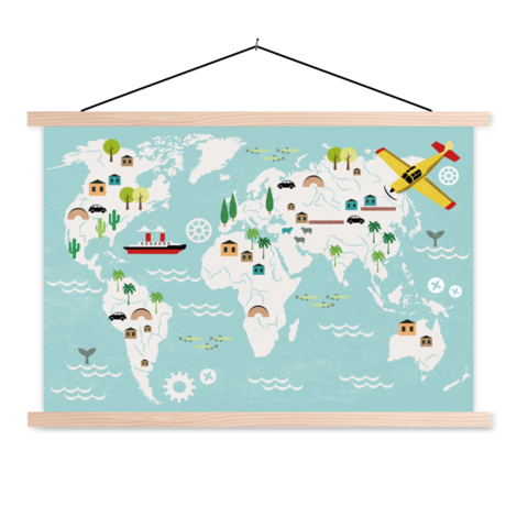 Met deze mooie lichte wereldkaart kan uw kind in gedachten al de wereld rond reizen. Neem je het vliegtuig, het schip of ga je toch liever in de auto?
